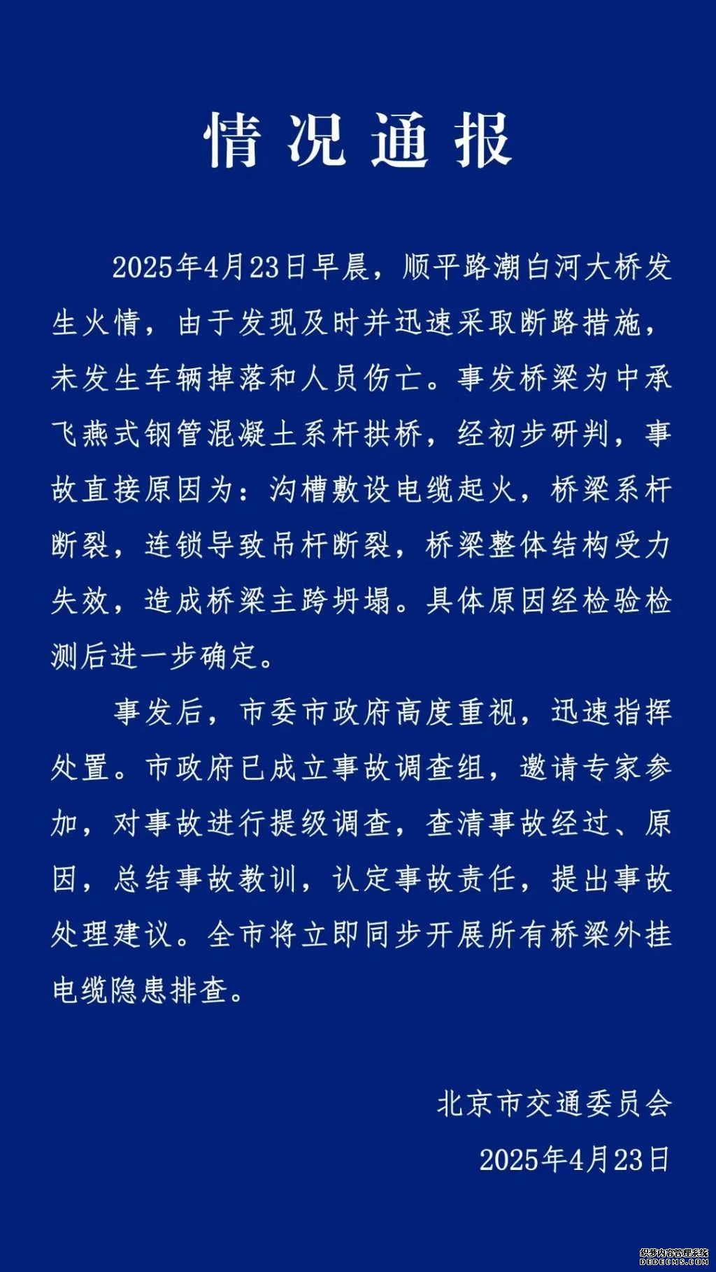 同日,北京市交通委通報順平路潮白河大橋事故:事發橋梁為中承飛燕式鋼管混凝土系桿拱橋,經初步研判,事故直接原因為:溝槽敷設電纜起火,橋梁系桿斷裂,連鎖導致吊桿斷裂,橋梁整體結構受力失效,造成橋梁主跨坍塌。具體原因經檢驗檢測后進一步確定。